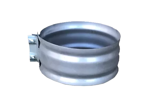 The most common part is a wide circular band of galvanized steel that wraps around the joint where two pipe ends meet.